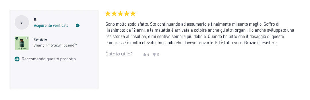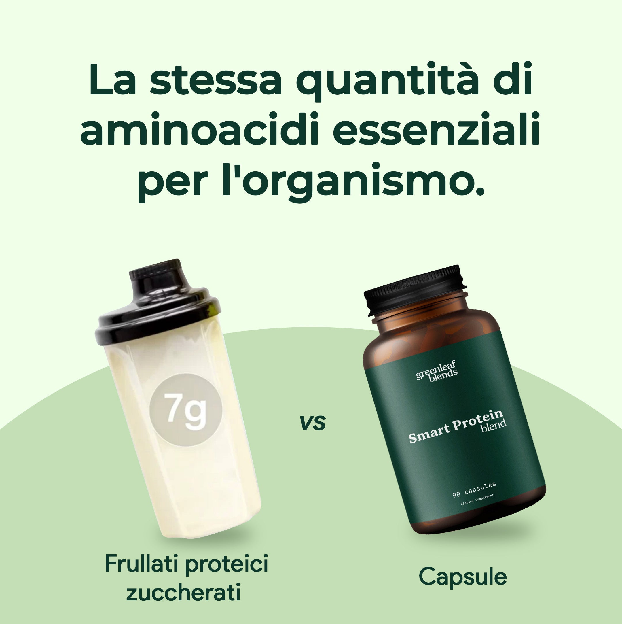1 compressa di Smart Protein corrisponde alla stessa quantità di amminoacidi essenziali utili per la costruzione cellulare di 7 g di frullati proteici. Ciò significa che 1 g di Smart Protein (1 compressa) ha lo stesso effetto di 7 g di proteine provenienti dai frullati.